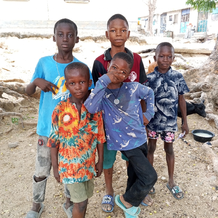 Five young males, appearing to be children or adolescents, are depicted standing outdoors in Adankolo, Nigeria, facing the camera