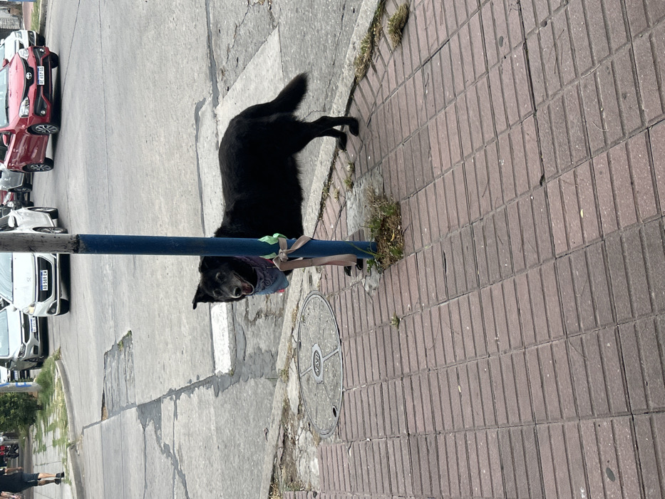 A black dog stands on a sidewalk, tethered to a blue pole with a green and brown leash. The dog has a light blue bandana around its neck. The sidewalk is made of reddish-brown rectangular pavers. To the left, a street is visible with parked cars. A manhole cover is located near the base of the pole. Weeds grow between the sidewalk and the street.