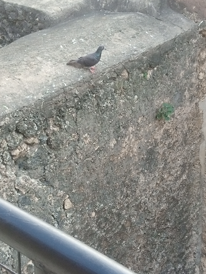 A dark gray rock pigeon with a lighter gray head and reddish-pink feet stands on a rough, light gray concrete ledge, facing right. The ledge surface contains sparse white material. Below the ledge, a heavily textured, dark gray-green weathered wall, appearing to be stone or concrete, descends vertically. This wall exhibits considerable erosion, discoloration, and supports a small cluster of green leafy plants in its mid-right section. A dark gray, cylindrical metal railing diagonally traverses the lower-left foreground. The scene is illuminated by ambient daylight. The image does not contain specific visual identifiers for Makadara/Mji Wa Kale ward, Kenya; however, the architectural elements align with aged urban construction. No human subjects or direct interactions are depicted.