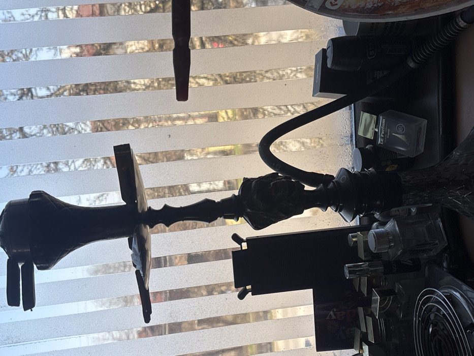 The image depicts an indoor scene from an elevated perspective, looking out through a window. The specific city and state are unknown. The primary subject is a dark-colored hookah, centrally positioned, silhouetted against the window's natural light. The hookah features a prominent, ornate stem with a carved human-like face. A circular tray is present below the bowl, containing what appears to be burnt charcoal or residue. A black, ribbed hose extends from the hookah's base, curving towards the right. The background consists of a window covered with vertical frosted or translucent strips, partially obscuring the view outside. Through these strips, bare tree branches and distant buildings or structures are visible under a bright sky, suggesting an outdoor urban or suburban environment during daylight. On the surface in front of the window, several objects are arranged. To the left of the hookah, a black rectangular object stands upright, possibly a phone or tablet stand. A collection of glass bottles, primarily perfume bottles of various sizes and shapes, are clustered on the surface. Some bottles are transparent, while others are dark. A label reading "Le Parfum" is visible on one bottle. To the far left, a circular electric coil heater for charcoal is partially visible. A black box and a dark handle-like object, consistent with a hookah hose mouthpiece, are also present on the right side. No individuals are visible in the scene. The overall lighting is strong from behind, creating silhouettes of the foreground objects and a bright, somewhat hazy backdrop. The surface appears to be a windowsill or a narrow table placed directly in front of the window.