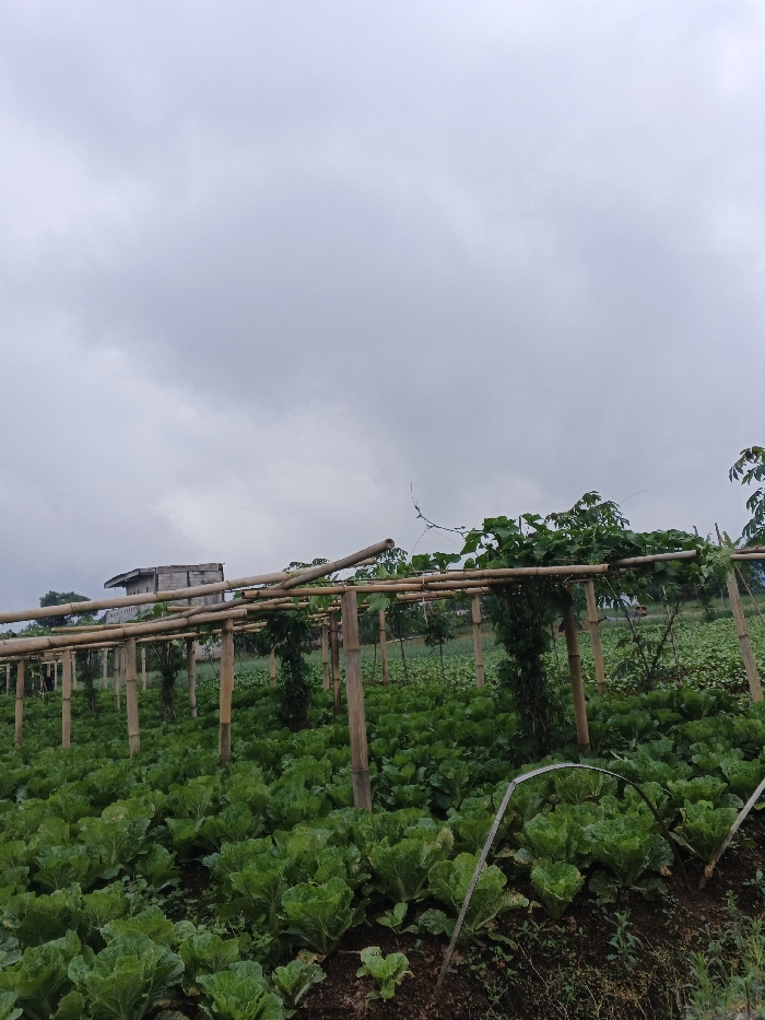 An agricultural field in Clacuc, Timor-Leste, is depicted under an overcast sky. The scene is dominated by dense rows of green, leafy vegetables, consistent with cabbage or lettuce plants, growing in dark soil across the foreground and mid-ground. A system of bamboo trellises, composed of vertical posts and horizontal crossbeams, is erected throughout the field, supporting climbing green vines. In the distant background, to the left, a light-colored, elevated building with a dark roof is partially visible, situated among distant trees. No individuals are present in the scene.