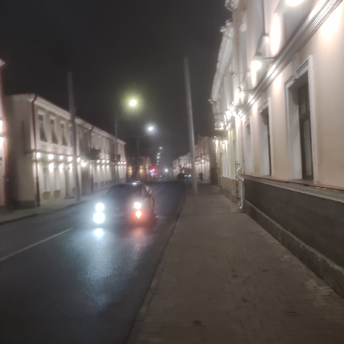 A nighttime street view shows a car with headlights on approaching on the left side of the road. To the left, buildings with lit windows line the street. On the right, a light-colored building stands close to the sidewalk, with windows visible. A street light illuminates the road further in the distance. A pedestrian walks distantly. The street appears wet and reflective.