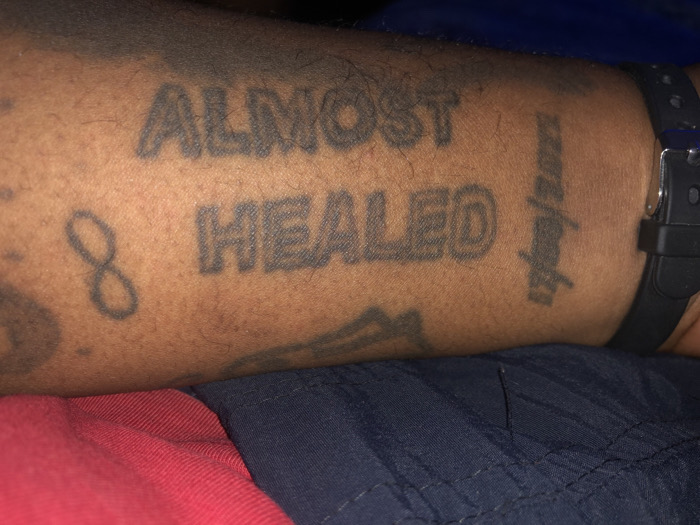 This image depicts a close-up view of a human forearm, likely positioned in Nyeri, Kenya. The skin tone is medium to dark, with fine hair visible. The forearm features several tattoos. Prominently displayed in the center are the words "ALMOST HEALED" in two lines, rendered in black, somewhat faded block letters. To the left of "ALMOST HEALED" is a black infinity symbol. To the right, a vertical tattoo, appearing to be a date such as "12/08/2023," is partially obscured by a black digital watch with a rubber strap worn on the wrist. Faint, additional tattoo elements are visible below the main text. The forearm rests over two distinct pieces of fabric: a red garment in the lower-left corner and a dark blue, textured fabric in the lower-right. The background is dark and indistinct, offering no further environmental details. No people are fully visible, only the arm. No specific actions or interactions are depicted.