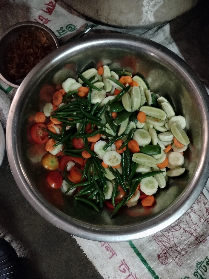 large silver bowl filled with a salad of sliced cucumbers, tomatoes, green chilies, carrots and limes. The bowl is on a beige and green patterned surface. The location is Lalmohan, Bangladesh, which is located at the coordinates 22.36 latitude and 90.769 longitude. There are no people in the image.