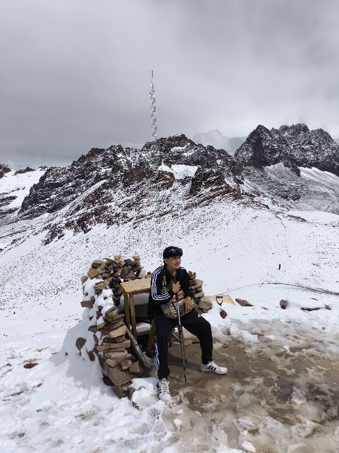 A young man in Adidas track suit sits on a wooden platform surrounded by stacked rocks, likely a shelter or marker, in a snowy mountain environment. He wears a cap and carries a patterned bag and walking stick. Behind him are snow-covered mountains under a cloudy sky, with a tall, ladder-like structure rising from one peak. The ground around the platform is a mix of snow and slush.