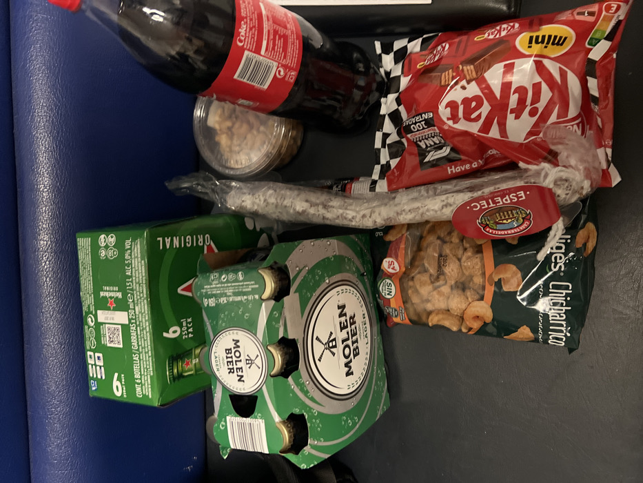 The image displays a collection of packaged food and beverage items resting on a dark, flat surface, with a blue upholstered surface in the background. Visible items include: * A green cardboard 6-pack of Heineken Original beer bottles, 250ml each, totaling 1.5L at 5.0% ABV. * A green cardboard 6-pack of Molen Bier Lager bottles. * A large plastic bottle of Coca-Cola with a red label. * A clear plastic container filled with what appear to be peanuts or mixed nuts. * A vacuum-sealed dry sausage, identified by a red and white "Espeletec" label, likely from Casa Tarradellas. * A transparent bag of "Chicharrico" (fried pork rinds/cracklings), bearing a "NIS" (Nutri-Score) label. * A red and white bag containing Kit Kat Mini chocolate bars. No people are present. The scene is static, depicting an arrangement of packaged consumer goods. The product labels, particularly "Chicharrico," "Espeletec" from Casa Tarradellas, and Spanish text on the Heineken packaging, confirm the items originate from a Spanish retail environment. While these products are consistent with purchases made in A Coruña, Spain, the exact location within the city, such as a specific store or address, is not discernible from the visual information provided.