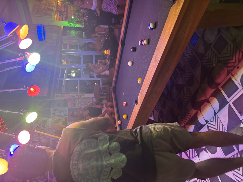 The scene depicts an interior view of a bar or lounge in Uluwatu, Indonesia, centered around a game of pool