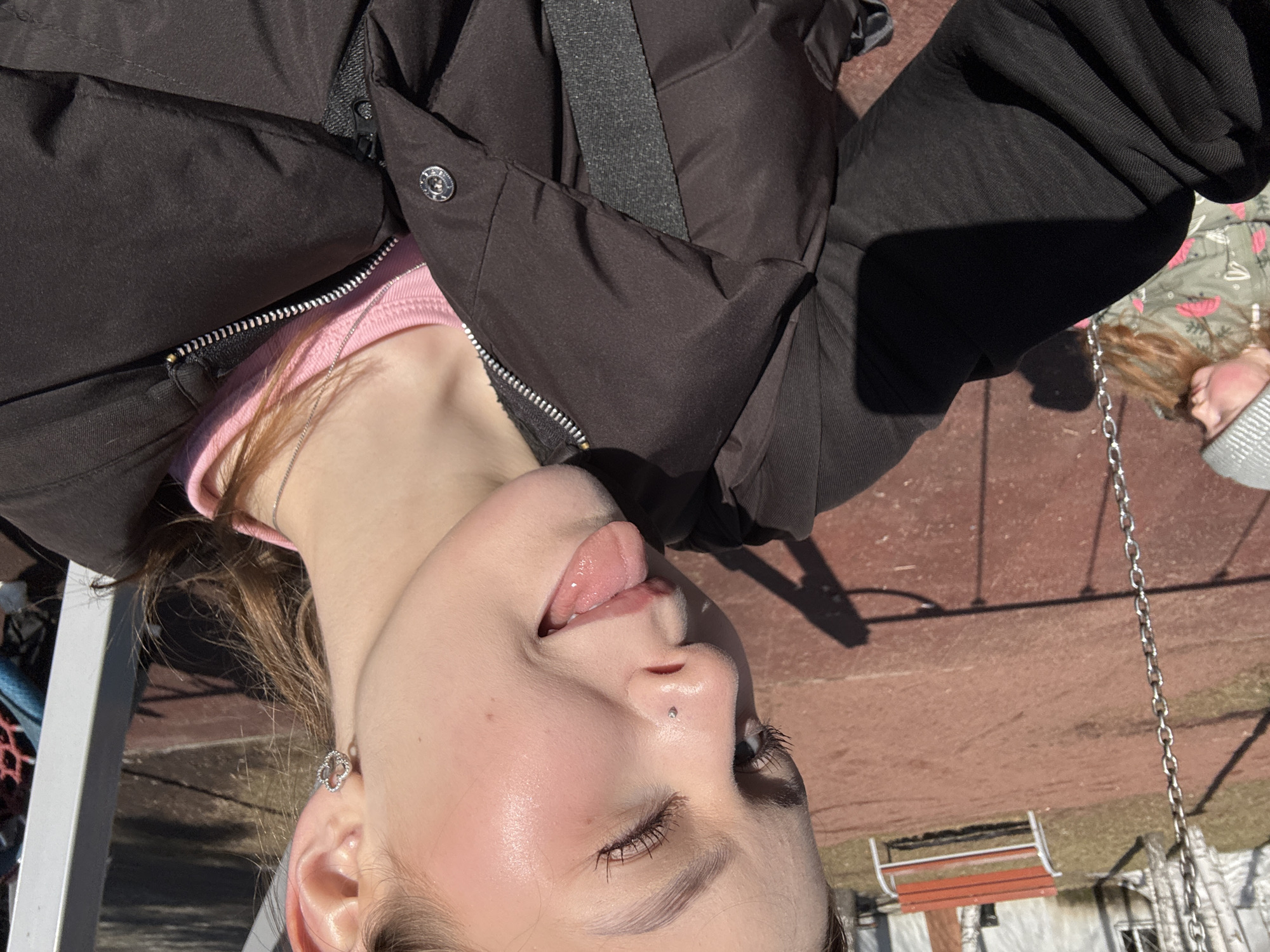 A young woman with fair skin, brown hair, and a nose piercing is depicted in a close-up, upward-facing selfie outdoors on a sunny day. She is wearing a pink top under a black puffer jacket with a metal zipper and button details. She has a playful expression with her tongue sticking out. To her right, a child lies on a swing, wearing a grey hat and a jacket with a floral pattern. The background consists of a playground area with a red-painted surface, swing chains, and a wooden bench with red slats. Based on the overall aesthetic and available context, the location is potentially a playground within the city of Yekaterinburg, Russia.