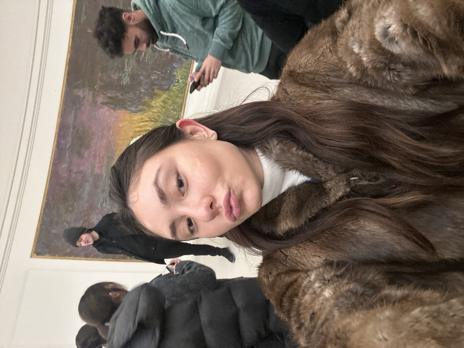 A selfie-style portrait captures a young woman in the foreground within one of the oval rooms of the Musée de l'Orangerie in Paris, France. She has long, dark hair, wears a white turtleneck beneath a brown fur coat, and pouts her lips towards the camera. Behind her, a panoramic Claude Monet "Water Lilies" painting, rendered in purples, blues, yellows, and greens, wraps around the curved, light-colored museum wall, framed in gold. Several other visitors occupy the mid-ground: a person in a dark puffy coat is seen from behind, engrossed with a smartphone to the left; a young man in a dark beanie and jacket stands centrally, looking left; and another young man with curly hair and a beard, wearing a green hooded sweatshirt, is also focused on a smartphone to the right. The scene is brightly lit, indicative of an indoor museum environment.