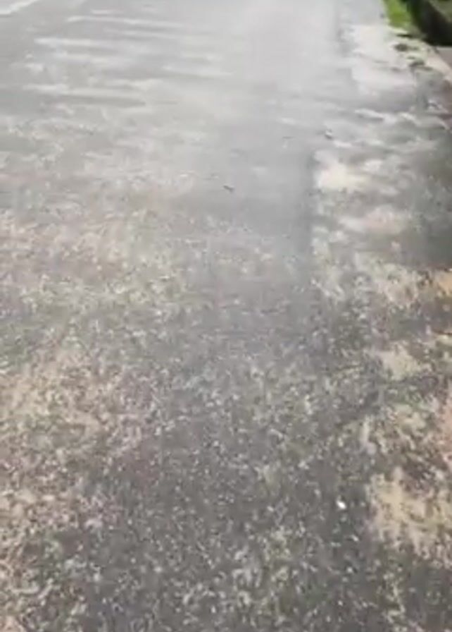 The video depicts a street after a rain. The road is paved with asphalt, which has a mottled texture. In the distance, buildings and other structures line the street. A small vehicle, possibly an auto-rickshaw, can be seen driving on the road. There are also pedestrians. The lighting suggests an overcast day. The overall tone is quiet and ordinary.
