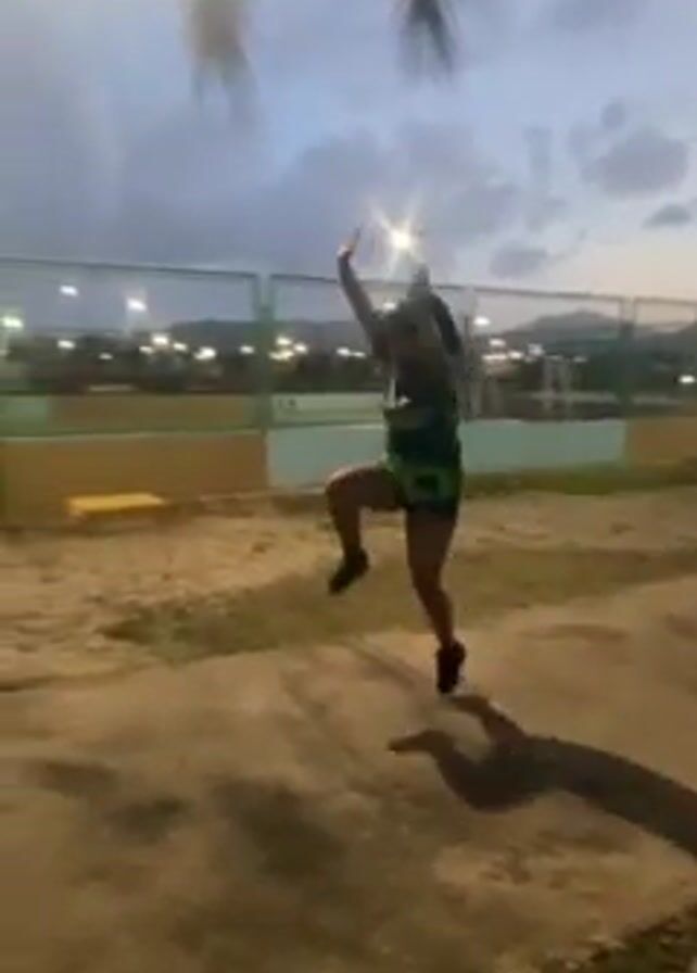 A woman is outside and performing a cartwheel. The woman is wearing a dark green and teal short-sleeved shirt, blue denim shorts, and black sneakers. The woman has dark hair that is short in length and pulled back from her face. She is on a paved section surrounded by gravel on either side. Behind her is a fence and a court. There are lights illuminating the court. The sky is dark with clouds. Mountains are in the background in the distance. After she completes the cartwheel she stands up and begins to laugh.