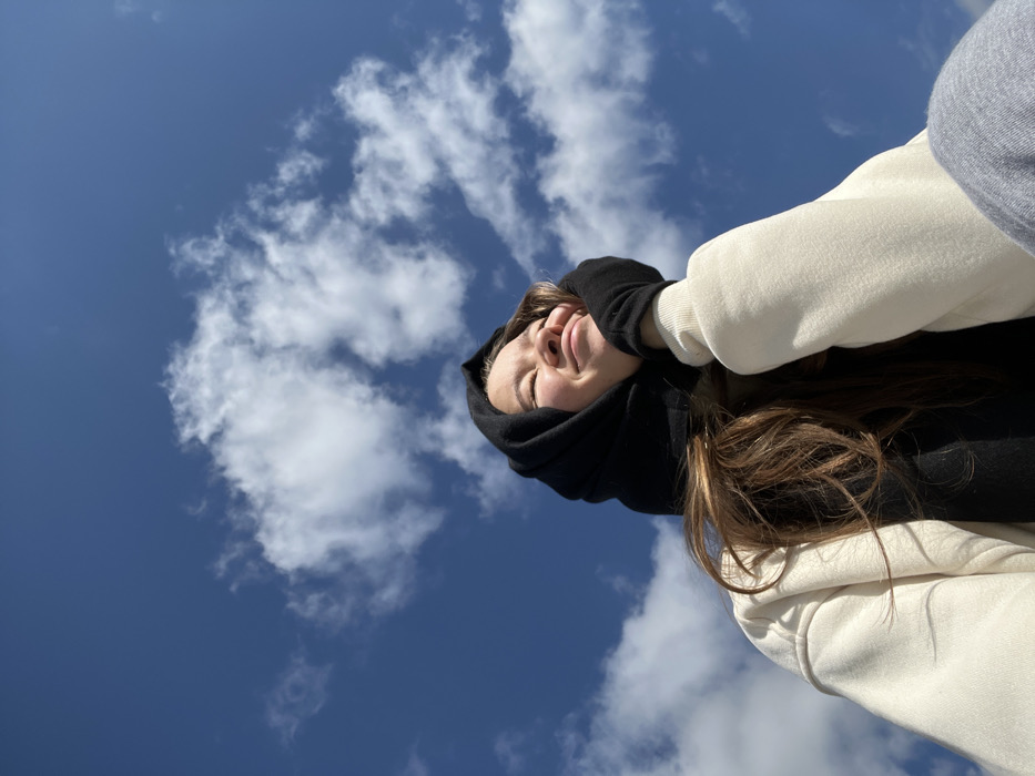 The image displays a young female subject photographed from a low-angle perspective, positioned against a backdrop of a clear blue sky dotted with white cumulus clouds. Her head is tilted upwards, eyes closed, with a gentle smile on her face. She has long brown hair, partially visible beneath a black hood worn over her head. Her left hand, encased in a black glove, rests against her left cheek and chin. She wears a light-colored (cream or beige) long-sleeved top, with a portion of a grey lower garment visible in the bottom right corner. The scene is illuminated by natural sunlight. No specific city features, landmarks, or geographical markers are present within the image to confirm the location as Krasnoyarsk, Russia.