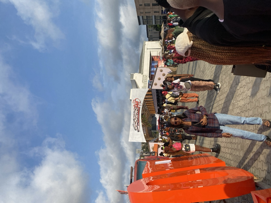 The image captures a crowded outdoor event in Itirin, Nigeria, under a partially cloudy blue sky. The ground is paved with interlocking concrete blocks. In the foreground, large, glossy orange sculptural letters are prominent on the left, partially obscuring a red vehicle, possibly a truck. A woman with dark hair, sunglasses, a plaid shirt, blue jeans, and sandals stands centrally, looking towards the camera with a black crossbody bag. The scene is densely populated with individuals, primarily young adults, navigating the event space. In the mid-ground, a white archway structure serves as a gateway, bearing a red and black stylized sign that reads "STREETPARKAD" or "STREET ART AD". To the right of this entrance, a white building displaying "cinemas FILMHOUSE" is visible. Other temporary structures, including stalls and tents, are interspersed among the crowd. People are depicted walking, standing, and observing the surroundings. The lighting is bright, indicative of daylight.