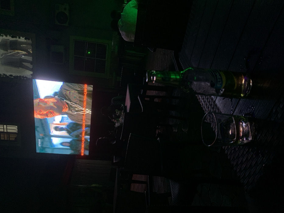 This image depicts a dimly lit outdoor or semi-outdoor lounge area in Port-Harcourt, Nigeria, at night