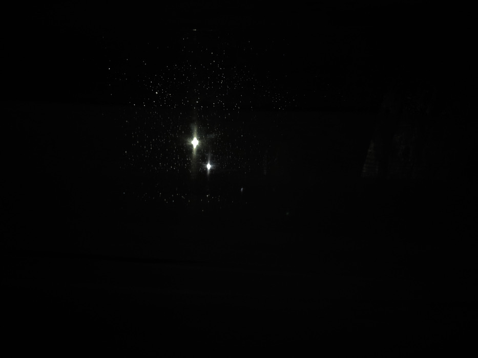This image depicts a nighttime scene in the city of Griboyedov, Armenia, characterized by extreme darkness. Two prominent, horizontally aligned bright white light sources are visible in the upper right portion of the frame, likely originating from streetlights or distant vehicle headlights. The right side of the image, particularly surrounding these lights, is covered with numerous small, reflective points, consistent with water droplets on a transparent surface such as a window or windshield, suggesting rain or condensation. The remainder of the frame is obscured by profound darkness, rendering any specific environmental features, structures, people, or objects indistinguishable. No actions or interactions are discernible.