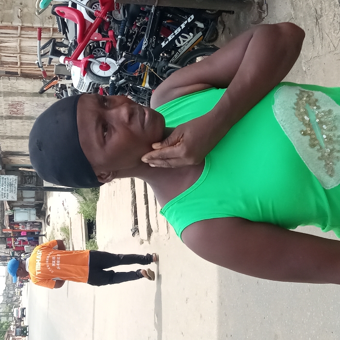The image depicts an outdoor street scene in Ura Nta Umuarandu, Nigeria, characterized by a commercial thoroughfare. In the foreground, a dark-skinned woman is positioned, facing slightly left. She wears a black head covering with visible minor tears and a bright green sleeveless top adorned with a light-colored, possibly translucent, sequined appliqué on the chest. Her right hand is raised, with fingers touching her right cheek or jawline. Her expression appears pensive. In the midground, a dark-skinned man walks away from the camera, proceeding down a paved road. He wears an orange short-sleeved t-shirt with "TIBHAR" and Chinese characters printed on the back, dark trousers, and open-toed sandals. A blue baseball cap covers his head. To the right of the scene, behind the woman, a dense collection of bicycles, children's tricycles (including a red one with a white seat), and a white ride-on toy car are displayed, suggesting a vendor's stall or shop. Behind these items, a light-colored, textured building wall is visible, along with a partially legible sign mounted on a pole or wall. The paved road features a concrete drainage channel running alongside it. Further down the road, additional vehicles are visible in the distance, and buildings line both sides of the street, consistent with an urban or semi-urban environment. The overall lighting is bright and diffuse, indicative of daytime.