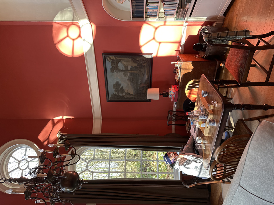 The scene depicts the interior of a brightly lit room in Stafford, United Kingdom, characterized by tall red walls and a light-colored wooden floor. Natural sunlight streams through two large white-framed windows on the left, casting prominent, distinct patterns onto the red walls and floor, indicative of the window structures. One window is a tall arch-top design, flanked by heavy brown curtains, while above it is a circular window with radial glazing bars. A large, ornate bronze-toned chandelier hangs from the ceiling near these windows. In the center foreground, a dark wooden rectangular dining table is set with various items including multiple patterned cups, clear drinking glasses, a small silver dish, a glass carafe, and a bottle of orange juice, all arranged around a wooden serving tray. An open newspaper or document lies on the table. Seated at the left side of this table is a male individual, appearing to be in his 20s or 30s. He wears a light grey hooded sweatshirt, a dark blue beanie, and dark trousers. He is holding a white smartphone to his right ear, engaged in a phone conversation, with his left arm resting on the table. He looks slightly upwards and to his right. Against the right wall, a dark wooden sideboard or cabinet holds a table lamp with a white shade, which is placed on a stack of red boxes. To the right of the lamp, various small dishes and items are visible on the sideboard. Above the sideboard hangs a large framed painting depicting a classical landscape scene with ruins and figures. In the far right corner, a tall, white built-in bookshelf with an arched top is filled with numerous books. A dark wooden bucket or bin stands on the floor in the lower right, next to a wooden chair over which a plaid scarf is draped. Part of a light grey upholstered sofa is visible in the lower left foreground. White trim or cornice runs along the top of the red walls.