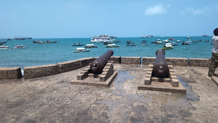 This image displays a waterfront scene in Zanzibar City, Tanzania, observed from a stone-paved promenade. Two dark, aged cannons are prominently positioned in the foreground, resting on stone block pedestals and oriented towards the ocean. The promenade floor consists of irregularly shaped stone blocks with several visible puddles. A low, curved stone wall separates the promenade from the sea. The water is a turquoise-blue hue, featuring numerous vessels, including a large white multi-deck passenger ferry in the mid-ground, surrounded by multiple smaller white motorboats, one distinct green-hulled boat, and several large cargo ships in the distant background. The sky above is clear blue with minimal cloud cover. On the far right of the image, an individual is partially visible from the mid-torso down, seen from the back, wearing a light-colored t-shirt with a graphic design and olive green cargo pants, standing and observing the ocean. No other individuals or specific interactions are discernible.