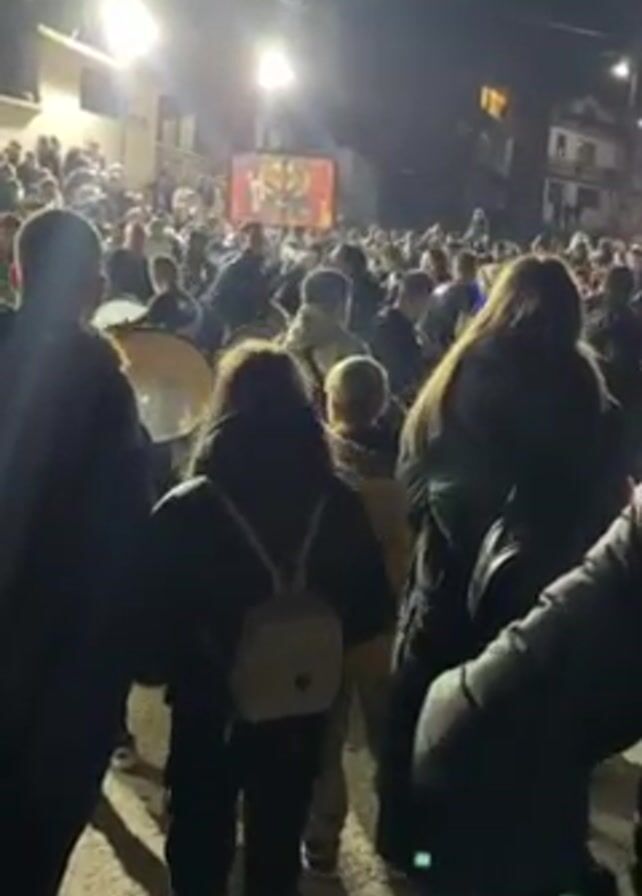 . The video shows a large crowd gathered at night, with a flat screen TV mounted high in the distance. In the foreground, people are holding and playing large drums. The camera is at ground level within the crowd. The environment is dark, with visible houses and streetlights in the background. The atmosphere appears lively and communal.
