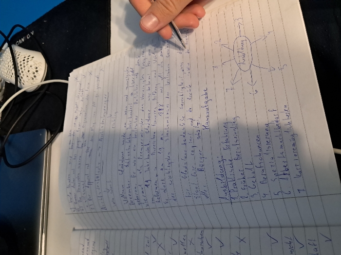 - "This image depicts a close-up, high-angle view of a person's light-skinned right hand holding a black and transparent ballpoint pen, actively writing on a white, lined notebook" by FM-6xMzX2, licensed under CC BY 4.0