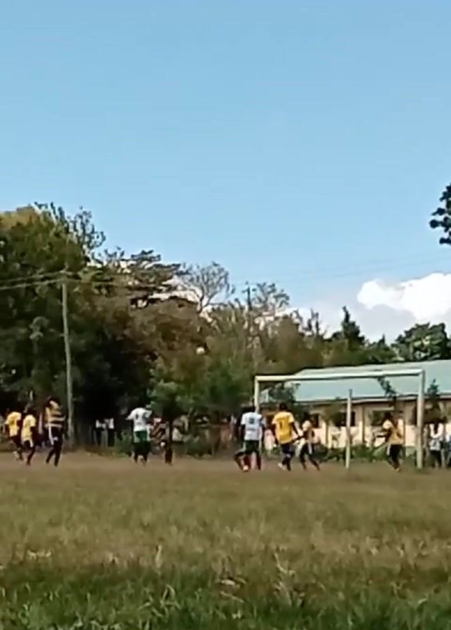 group of people playing a soccer game on a grassy field with a soccer goal in the background. The players are wearing yellow and blue jerseys. Trees and a building can be seen in the background. The sky is blue with some clouds. A person is holding the camera.