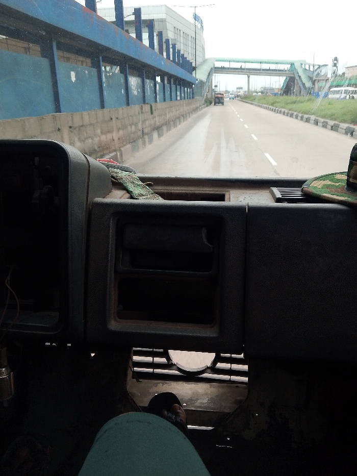 The image presents a street scene in Alaiyabiagba, Nigeria, viewed from the interior of a vehicle, likely from the driver or front passenger seat, under an overcast sky. In the immediate foreground, the dark grey dashboard of the vehicle is visible, featuring two central recessed rectangular compartments. Exposed wiring is present on the left side of the dashboard. A camouflage-patterned object, consistent with a cap or hat, rests on the right side of the dashboard. Below the dashboard, a person's lower leg, clad in light-colored trousers, is partially visible on the left, with a dark foot or shoe seen through a grated opening in the vehicle's floor. A metallic cylindrical object is positioned on the lower left interior. Through the windshield, a multi-lane asphalt road, appearing damp, extends directly forward with white lane markings. On the left side of the road, a low concrete block barrier separates the road from a long, elevated blue structure featuring vertical supports and solid panels, which runs parallel to the roadway. Behind this blue structure, a modern, multi-story white building with numerous windows is visible. On the right side of the road, a black and white striped curb separates the road from a strip of green vegetation. Further down the road, a large pedestrian overpass, constructed of green or grey metal with multiple ramps, spans the entire width of the road. Several distant vehicles, including at least one truck, are present on the road.