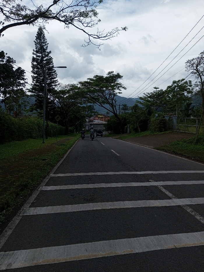 The image displays an asphalt road in Ariyalai, Sri Lanka, under an overcast sky. In the foreground, the dark asphalt road features four distinct horizontal white stripes. To the left, a green grassy verge runs parallel to the road. The road extends into the midground, subtly curving to the right, bordered by lush green vegetation including tall trees and bushes. Two motorcycles, each with at least one rider, are observed moving away from the viewer in the distance, followed by a dark vehicle. A tall, slender conifer tree stands prominently on the left side of the road, adjacent to a street light pole. A yellow diamond-shaped road sign is partially visible on the left. A metal gate is present on the right side of the road in the mid-distance. Overhead power lines traverse the upper right quadrant of the image. In the background, buildings with visible roofs are nestled among trees, and distant green mountains are present beneath the cloudy sky.