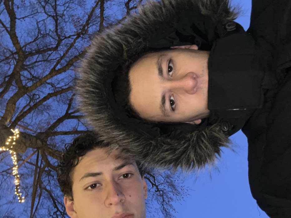 The image displays two males in a close-up, low-angle composition against a dark blue evening or twilight sky. The primary subject, in the foreground, is a male wearing a black winter jacket with a raised, fur-lined hood. His face is largely visible, with his eyes open and directed towards the camera; the lower portion of his face (mouth and chin) is obscured by the jacket's collar. Slightly above and to the left, the upper face of a second male is partially visible, also looking towards the camera. This individual has dark, curly hair. In the background, leafless tree branches are silhouetted against the sky, with some branches in the upper left adorned with numerous small, warm-toned string lights. The environment is an urban outdoor setting, consistent with a winter evening in a city like Vienna, Austria. The exact location within Vienna is not discernible from the visual information provided.