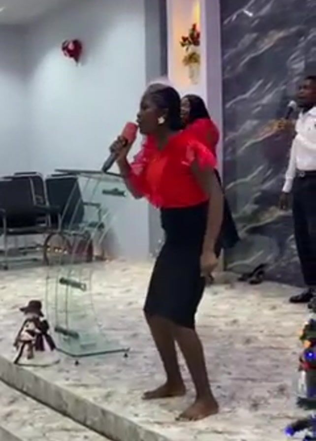woman dancing and singing into a microphone in what appears to be a church. She is wearing a red top with puffy sleeves and a black skirt. A second woman in a similar outfit dances and sings behind her, and a man in a white shirt and tie stands to the right, holding a microphone. The area has a Christmas tree and other festive decorations. The floor is made of light-colored marble-like tiles, and there is a glass podium. Several black chairs are visible in the background. The overall atmosphere is lively and celebratory.