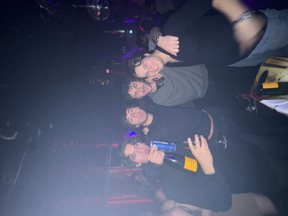 Four young men pose for a photo in a dimly lit club with a disco ball hanging overhead. The person in the front is drinking from a can while holding a bottle of champagne and a wine glass. Another bottle of champagne sits on a nearby table. The group is dressed casually, and the atmosphere appears to be celebratory. Red and purple lights add to the nightlife ambiance.