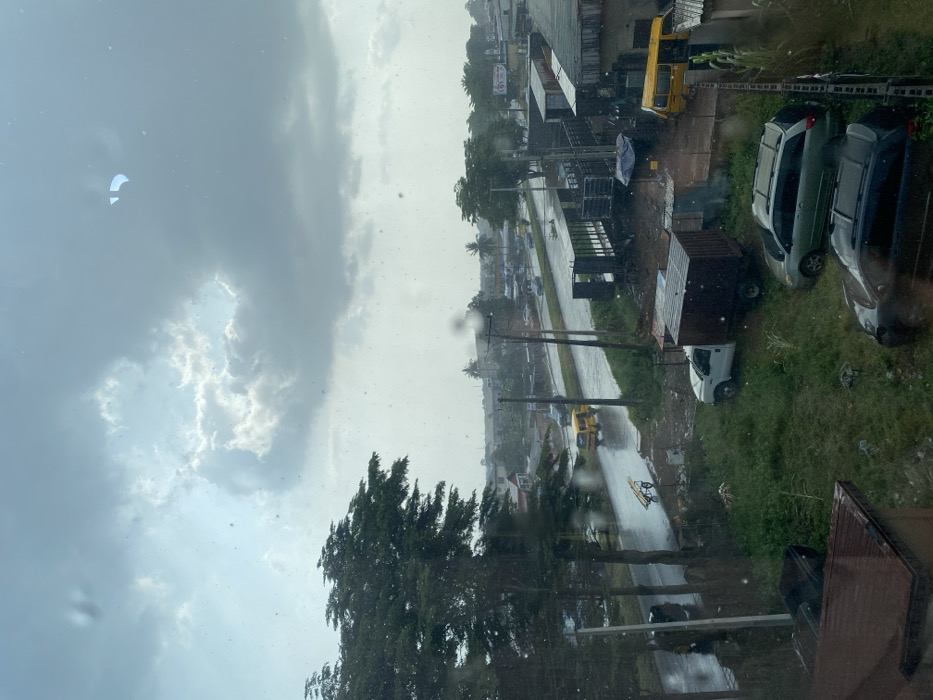 This image captures an overhead view of a wet street and surrounding urban landscape in Egan, Nigeria, under an overcast sky with patches of brighter clouds. Rain droplets or smudges are visible on the camera lens or viewing surface. In the foreground, a patch of unkempt green grass holds three parked vehicles: a white box truck with a brown cargo compartment, followed by a light-colored minivan/SUV, and then a darker-colored minivan/SUV, all facing left. A partial view of a brown tiled roof is visible in the lower left. To the immediate right of the grassy patch, an area with industrial containers or structures, including a partially visible yellow commercial bus, is present. The midground features a two-lane asphalt road, visibly wet from recent rain, running from the lower-left to the upper-right. A yellow commercial passenger bus (danfo) is seen moving right on the far lane, while a three-wheeled commercial vehicle (keke napep) and a person pushing a two-wheeled cart with a ladder-like object are on the near lane, also moving right. Utility poles and dense green trees line both sides of the road. The background shows further urban development with various buildings, structures, and scattered trees, fading into the horizon under the cloudy sky.