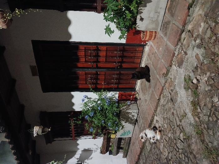 A white building with dark-brown shuttered windows is partially visible. A dark cat sits on red brick pavement near the shutters. A planter with green plants is to the right of the cat. A smaller white and gray dog stands on the pavement near the bottom-right. Some of the pavement is uneven stone. A second planter with blue flowers is also visible below the first window.