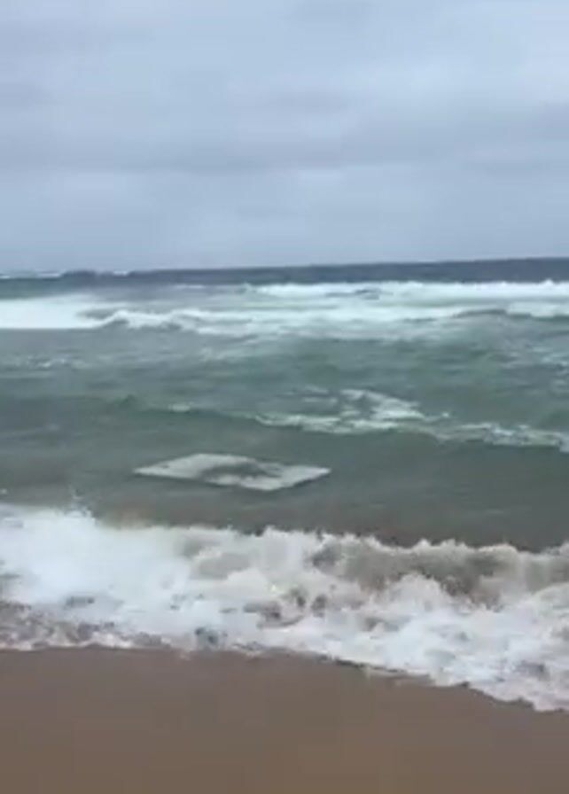 sandy beach with waves crashing on the shore. In the water, a rectangular object, possibly a board or panel, is floating and being moved by the waves. The sky is overcast, suggesting a cloudy day. There are no people visible in the frame.