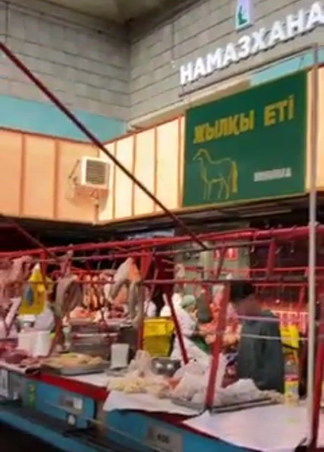 The camera slowly pans up and out, revealing the interior of an indoor market. In the foreground, various cuts of meat are displayed on a series of blue-and-red stalls. Vendors, some wearing hats and masks, are working behind the stalls. Above the stalls, a green sign written in two languages, one of which includes the word "KONИНА", depicts a silhouette of a horse. The ceiling is high and lit with rows of fluorescent lights. People, likely customers, can be seen walking between the stalls. The overall atmosphere is busy, suggesting a bustling marketplace.
