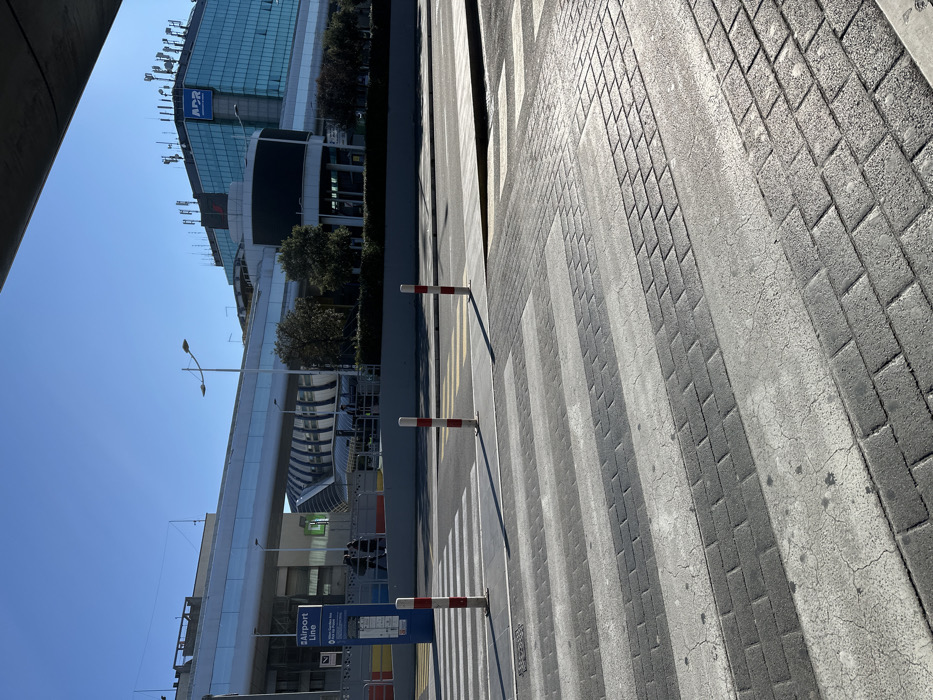 pedestrian crossing with bollards in the foreground. Behind this, there is a bus stop sign. Overhead walkways and modern buildings are visible further back, under a clear blue sky. The perspective is angled, making the scene appear tilted. The crossing is lined with patterned paving stones. The architectural style of the airport and surrounding infrastructure is contemporary.