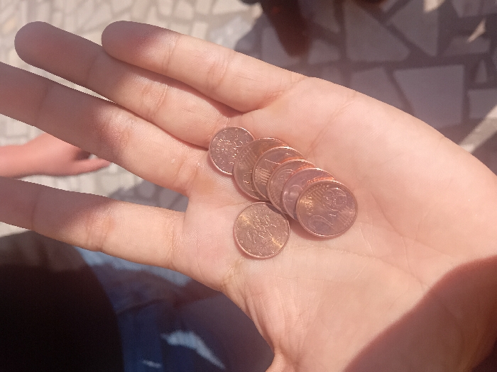 - "An upward-facing human hand, likely the right hand, holds approximately eight to nine copper-colored Euro cent coins in its open palm" by FM-plK4l2, licensed under CC BY 4.0