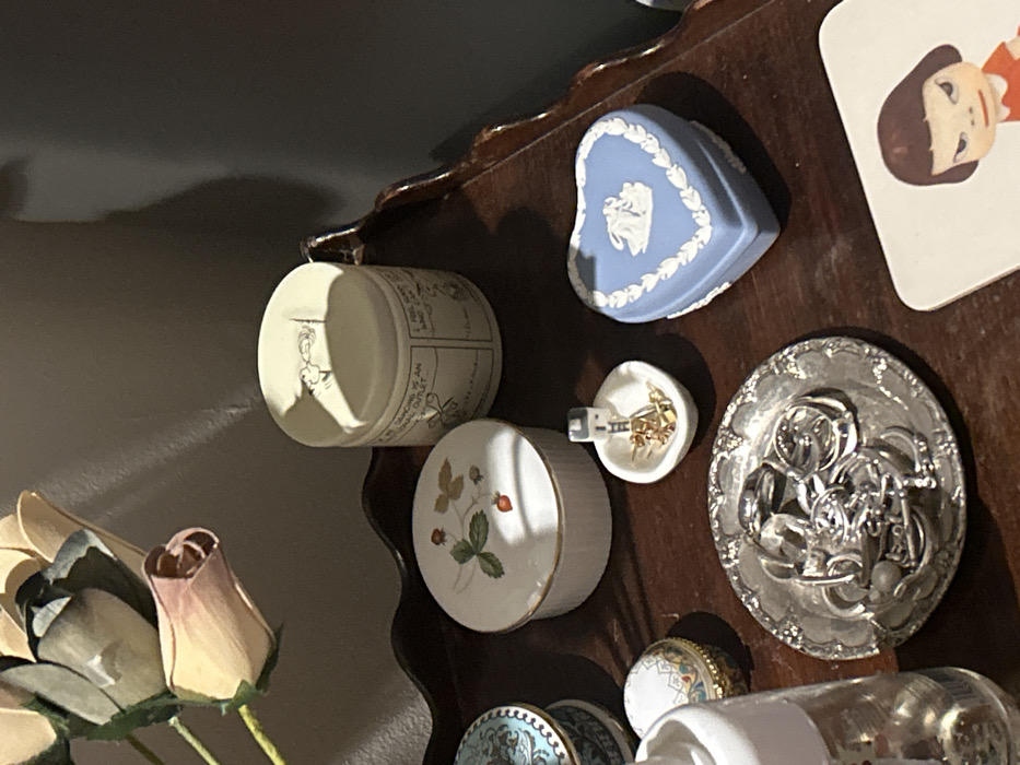 A collection of small, decorative items sits on a dark wooden shelf. A round, white tin with a cartoon image rests near a round, white ceramic box with strawberry designs. A light blue, heart-shaped box sits next to a small, white dish holding gold jewelry. A round, silver tray overflowing with silver rings is nearby. Below are a small, decorated egg and the top of a white bottle. A bouquet of pale, artificial flowers is visible in the lower left corner.