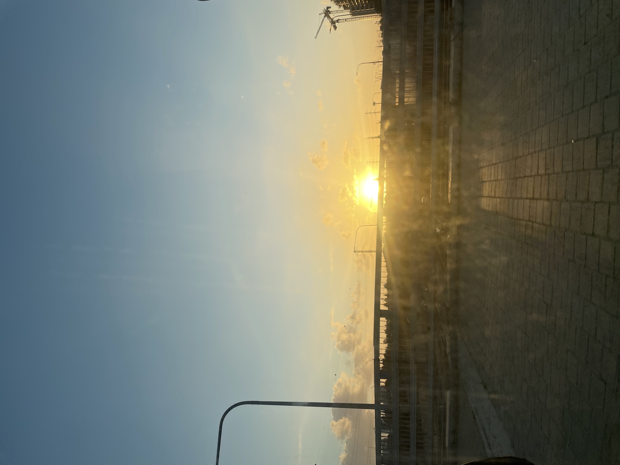 sunset in Raanana, Israel. A crane is visible in the skyline, indicating construction. A bridge or overpass is present, with concrete barriers along the sides. Streetlights line the road. The sun is bright in the center, creating a glare. The sky is light blue. Part of a vehicle interior is visible in the lower portion of the image. The road surface is paved with blocks.