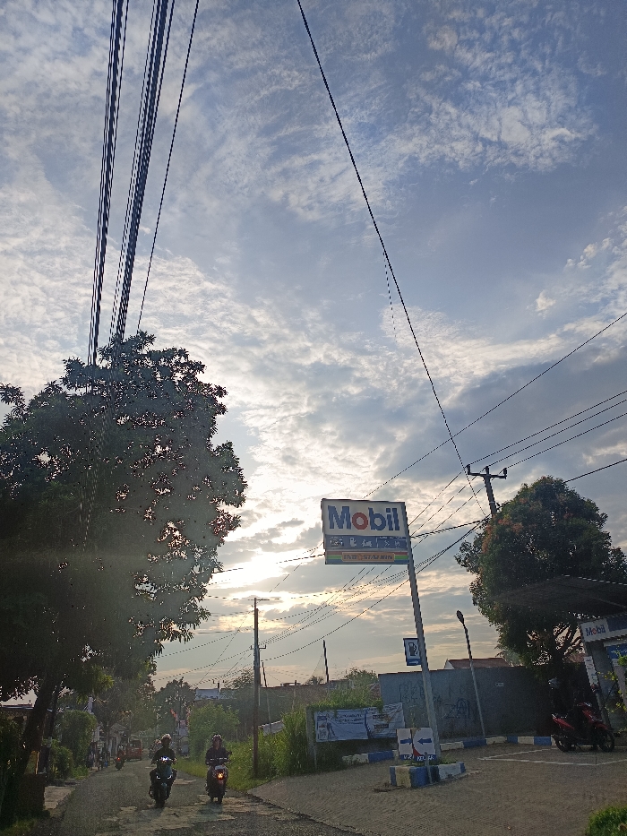This image depicts a daytime street scene in Cianjur, Indonesia. The sky is largely covered by diffuse, scattered clouds, with the sun low on the horizon, creating a bright haze in the mid-distance. Numerous dark utility lines crisscross the upper portion of the frame, originating from multiple utility poles. In the lower-left foreground, a dirt or unpaved road is visible. Two individuals, both wearing helmets, are riding motorcycles towards the viewer on this path. To the immediate right of the path, a prominent blue and white "Mobil" sign on a metal pole stands, indicating a fuel station. The sign features icons for a fuel pump, convenience store, and an ATM, with the text "INDOMARET" and "STAZAM" visible below the "Mobil" logo. To the left of the frame, a large, dense green tree occupies the midground, partially obscuring views of distant structures. To the right of the Mobil sign, another green tree with some reddish foliage is visible. Blue and white checkered concrete barriers or bollards mark the entrance/exit area of the Mobil station. A red scooter is partially visible, parked to the right of the Mobil sign, near what appears to be part of the station's structure. In the background, behind the Mobil sign, a wall with visible graffiti and various posters is present. The scene is illuminated by natural light, indicative of either early morning or late afternoon.