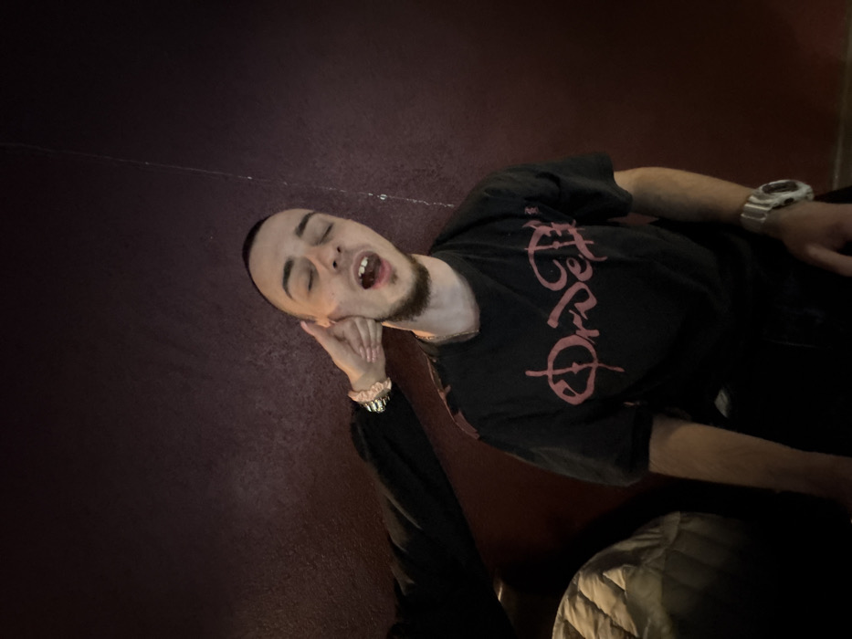 The scene is located in the city of Sliven, Bulgaria, and depicts an indoor environment with a dark reddish-brown background, possibly a wall or upholstered surface, featuring a faint vertical seam in the upper right. One male subject is visible from the chest up, positioned slightly to the right of the frame's center. He has a shaved head, light complexion, and a short beard. He wears a dark, short-sleeved t-shirt with a pink/red stylized graphic text on the front, a silver-colored chain around his neck, and a silver-colored digital watch on his left wrist. His eyes are closed, and his mouth is open. The left arm and open hand of a second, unseen subject extend from the left side of the frame. This arm is clad in a dark, long-sleeved garment and displays a gold-colored wristwatch or bracelet and a light pink scrunchie on the wrist. The hand is in direct contact with the left cheek and jaw area of the male subject. A light-colored, quilted object is partially visible in the lower-left corner behind the male subject. The lighting is dim throughout the scene.