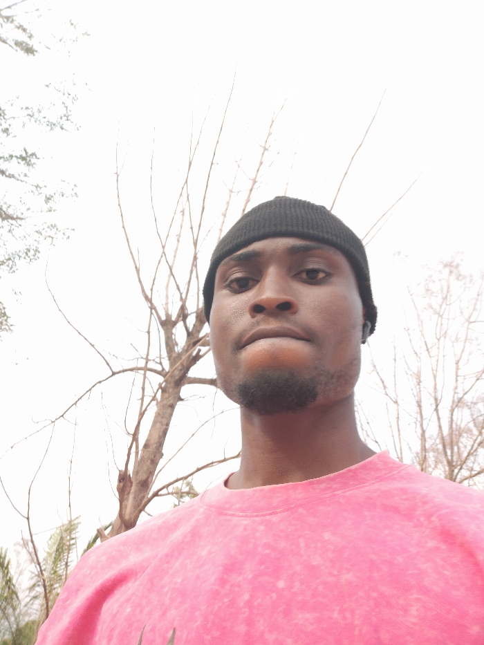 A young, dark-skinned man wearing a black knit cap and a pink sweatshirt looks directly at the camera. He has short facial hair. The background consists of bare trees against a bright, overcast sky. A small earbud is visible in his left ear. The perspective is slightly from below, emphasizing the man's upper body.
