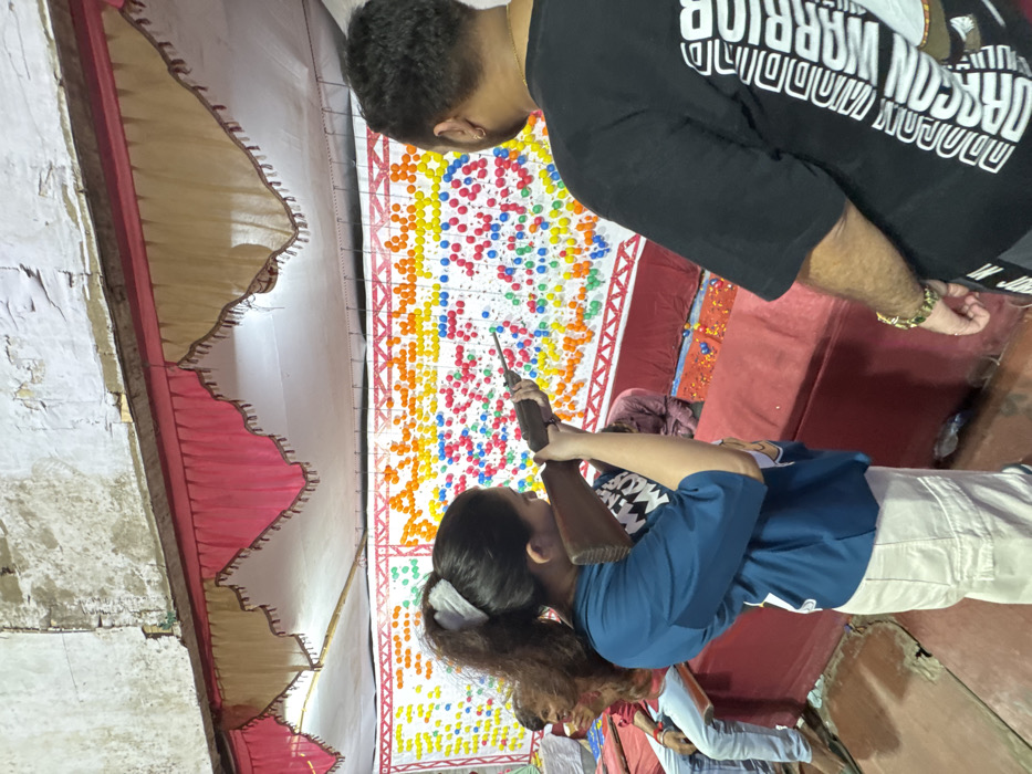 An indoor scene within a shooting game stall in Bidhannagar, India, is depicted. A female, positioned on the left, is actively participating in the game. She has dark hair tied in a high ponytail with a white scrunchie, wears a dark teal t-shirt with a white graphic on the front, and light-colored cargo pants. She is holding a dark brown and silver air rifle, resting the buttstock against her right shoulder and aiming it towards a target wall. The target wall, spanning the background, is covered with a grid of small, colorful balloons in red, blue, green, yellow, and orange. Below the balloons, a red and white fabric border with green accents is visible. Above the target wall, a white ceiling is partially obscured by draped pink and beige fabric with dark tassels. The upper wall section above the drapes exhibits cracked and peeling light-colored plaster. To the right, a male figure is observed from behind and the right side. He has short dark hair and a beard, wearing a black t-shirt with white "DRAGON WARRIOR" text printed vertically on the back. A gold-colored watch is visible on his left wrist. He stands near the female, observing the game. In the far left background, another individual is partially visible, seated on a light-colored bench, wearing blue jeans. A red cushioned counter surface extends across the foreground, where the main subjects are positioned. The floor beneath appears dark and uneven.
