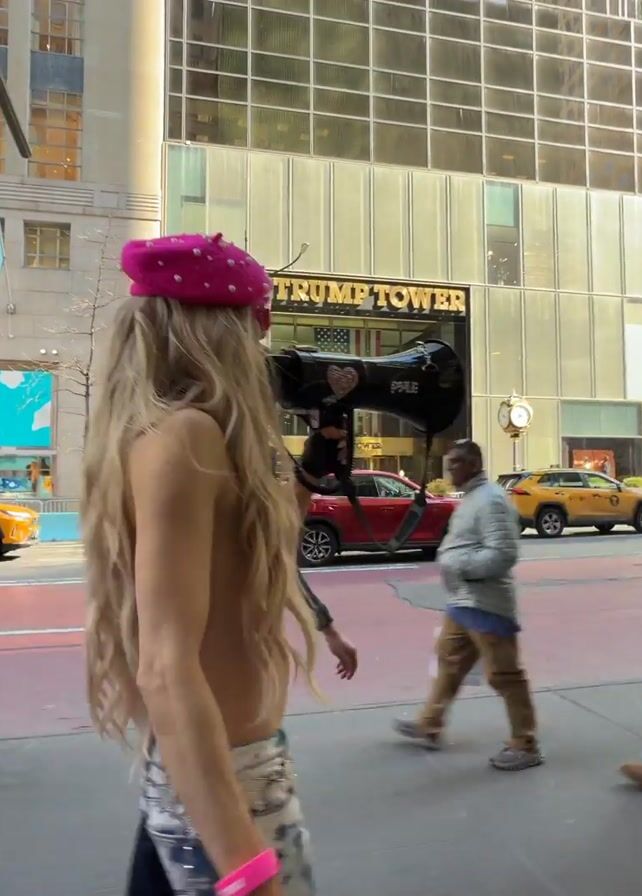 Footage shows a person speaking to a crowd about Donald Trump changing gender identity back to male. The speaker is walking through a crowded city square, possibly New York. They are wearing a pink beret and light-colored top with zebra patterned pants. A man wearing a black jacket raises both arms in the air, seemingly dancing. A yellow taxi cab can be seen in the background.