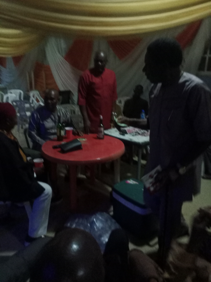 This image captures a dimly lit indoor social gathering within a decorated event space in the city of Unknown, Unknown. The ceiling and walls are draped with alternating yellow/gold and white/cream fabric panels. Five adult males of African ethnicity are present. In the foreground right, a man wearing a dark grey traditional garment stands, facing left, holding an indistinct item in his right hand. To his left, a man in a red traditional top stands behind a red circular plastic table. At this table, a man in a striped long-sleeved shirt is seated, positioned towards the right foreground, with a beer bottle and a red plastic cup directly in front of him. Partially visible in the foreground left, another man in a dark top, white trousers, and a red cap is seated at the same red table, holding a red plastic cup. A black wallet and an additional beer bottle are present on the red table. In the background right, a silhouetted figure is seated at a white rectangular table, with several white plastic chairs visible in the vicinity. A green and purple/blue cooler box rests on the floor in the mid-ground right, near dark, indistinguishable objects, possibly bags. The scene depicts an informal social gathering where participants are seated and standing, engaging in conversation or activity, with beverages present.