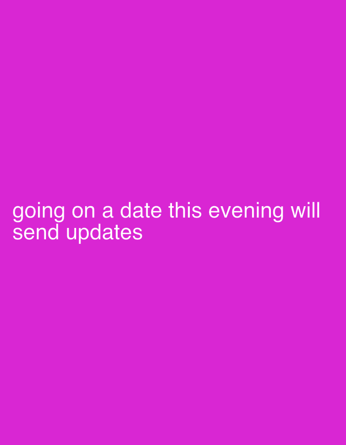 The image displays a solid magenta background (#E000B2 or similar hex code). White sans-serif text is centered horizontally and positioned in the lower portion of the frame, spanning two lines. The text reads: "going on a date this evening will send updates". There are no other visible subjects, objects, people, actions, or specific environmental details depicted. The image contains no visual information that indicates a specific location within the city of London, United Kingdom, or any other geographical area.