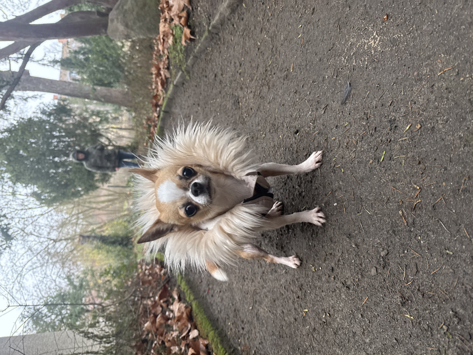 - "A tan and white chihuahua dog, exhibiting a prominent white facial stripe, stands centrally on a dirt path in Berlin, Germany" by FM-eQUGe2, licensed under CC BY 4.0