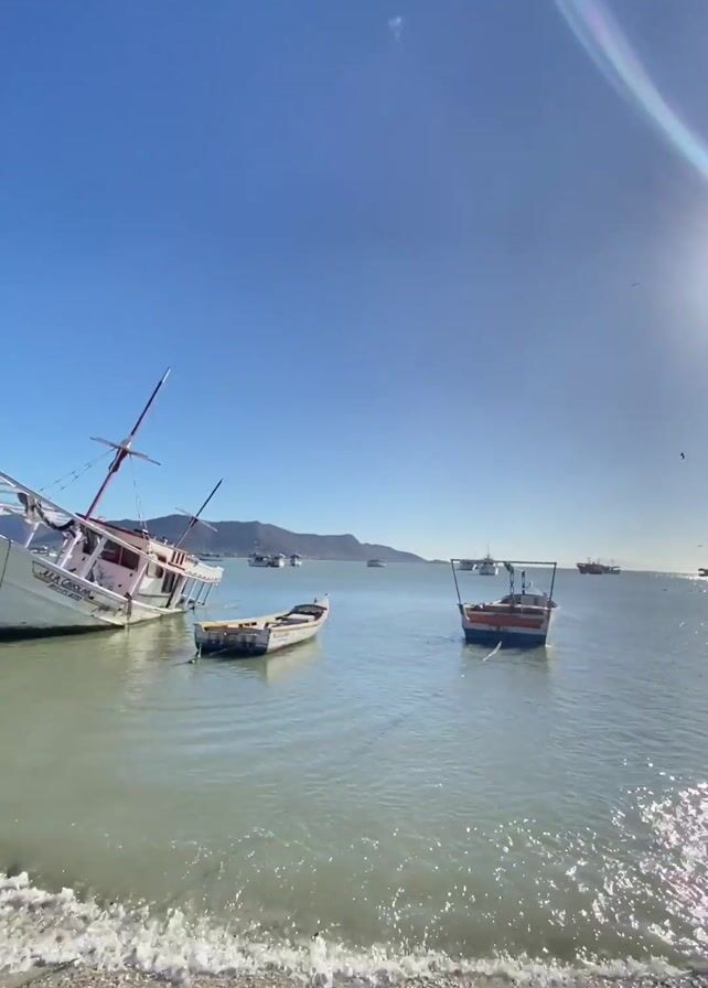 boat named "Julia Carolina" partially submerged in shallow, clear water along a beach. The boat is predominantly white with red accents and appears old and worn, with some of its structure exposed. The water is calm, and the sky is clear and blue, with the sun shining brightly. Other boats are visible in the distance, and a mountain range forms the backdrop. The beach is composed of small shells. The camera moves slightly closer to the boat, providing a better view of its condition.