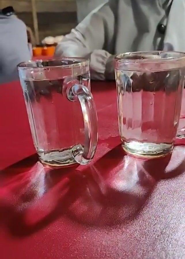interior of a simple restaurant, focusing on two glasses of water on a red table, and a young boy sitting at the table. The glasses are mostly full. The boy is wearing a light grey shirt. He looks up at the camera with a blank expression. Other people are sitting at tables in the background, visible through a window. The restaurant seems to be constructed of wood. The lighting is somewhat dim, creating strong shadows from the glasses.