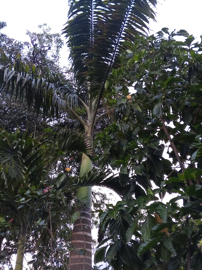 The scene depicts a dense tropical arboreal landscape in Sabaneta, Venezuela. A prominent palm tree dominates the center-left, exhibiting a ringed brown trunk, a smooth pale green crownshaft, and dark green pinnate fronds extending upward and outward. Adjacent to it on the right is a broadleaf tree characterized by numerous large, dark green leaves and occasional small, pale yellow-green objects, possibly nascent fruit or flowers. Additional dark green foliage, including elements of other palms, is visible on the far left. The background consists of a uniformly light, possibly overcast, sky. No persons, animals, or artificial structures are discernible within the frame.