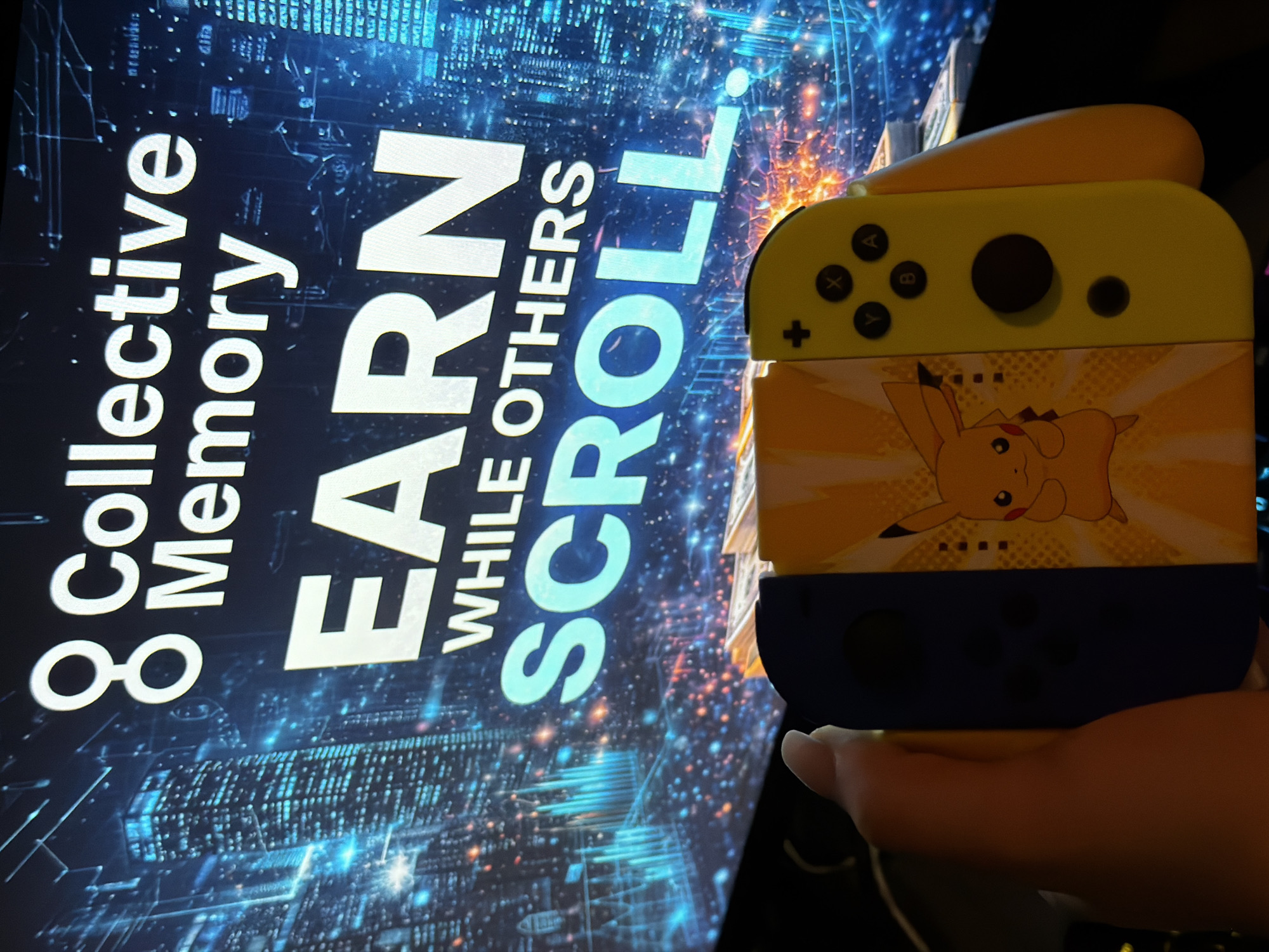 A person is holding a yellow and blue Pikachu-themed Nintendo Switch Joy-Con controller in front of a screen. The screen displays a blue digital-themed image with white and light blue text that reads "8 Collective Memory", "EARN", and "SCROLL WHILE OTHERS". The city of Varna, Bulgaria is not apparent in the image.